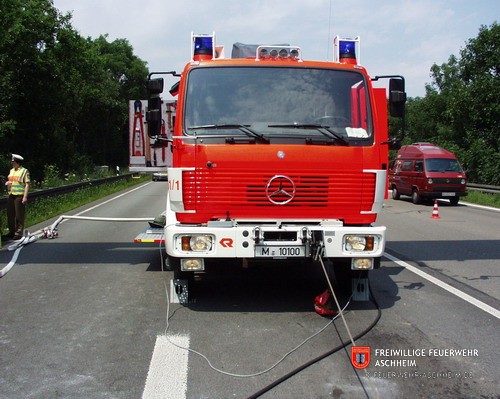 Die Feuerwehr Aschheim wurde zusammen mit der Feuerwehr Ismaning, dem ABC – Zug München Land und Teilen der Kreisbranddirektion München Land mit dem Alarmstichwort „Verkehrsunfall 2 LKW, eine Person eingeschlossen, Gefahrgut läuft aus“ auf die BAB 99 in Fahrtrichtung Salzburg alarmiert. Ein mit Papier beladener 7,5 Tonnen LKW war auf einen mit Benzin geladenen Tankzug aufgefahren. Dabei verletzte sich der Fahrer des aufgefahrenen LKW und wurde in seinem Führerhaus eingeschlossen.