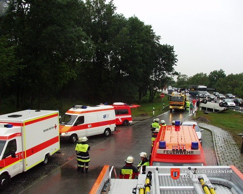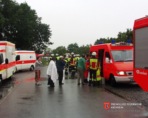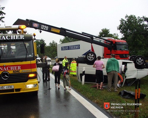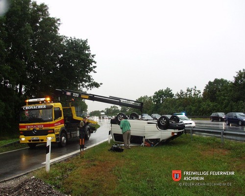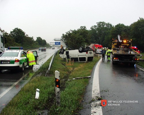 Die Feuerwehr Aschheim wurde auf die Bundesautobahn 99 in Fahrtrichtung Salzburg alarmiert. Ein voll besetzter Kleinbus war an einem Parkplatz von der Fahrbahn abgekommen, überschlug sich und blieb auf dem Dach liegen.