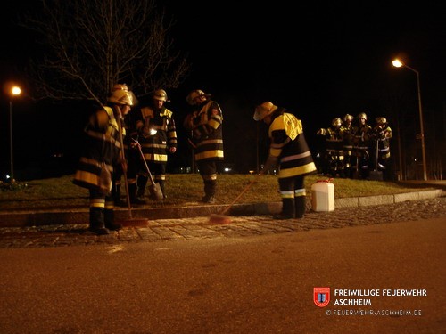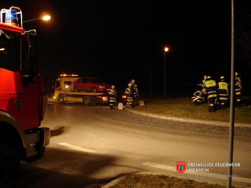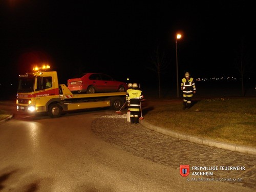 Die Feuerwehr Aschheim wurde zu einem Verkehrsunfall im Kreisverkehr Ost alarmiert. Eine Frau war aus Richtung Kirchheim kommend auf den Kreisverkehr aufgefahren, wobei die Ölwanne des Fahrzeuges dabei beschädigt.