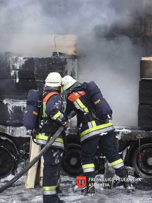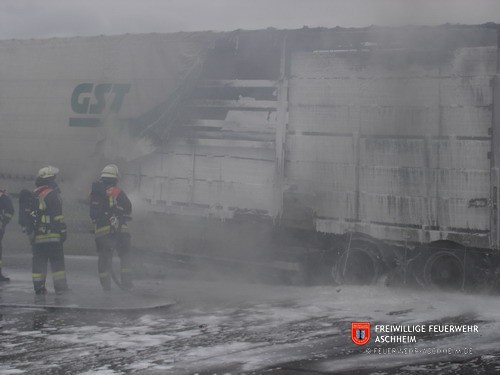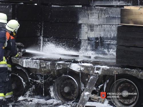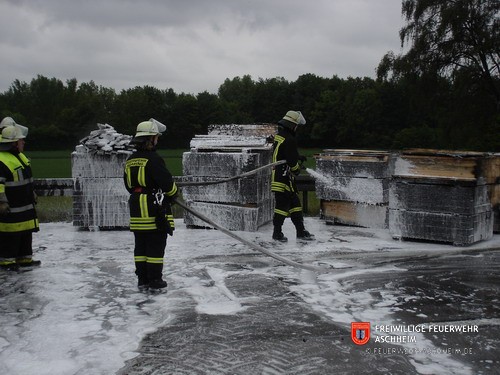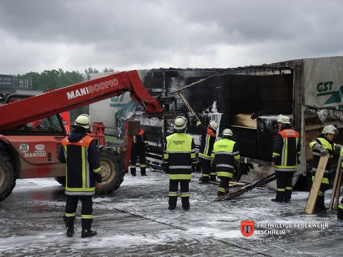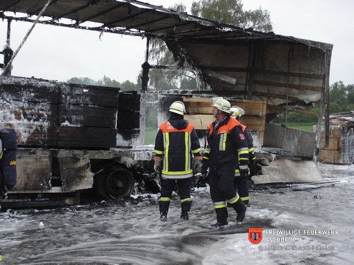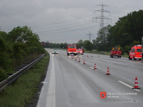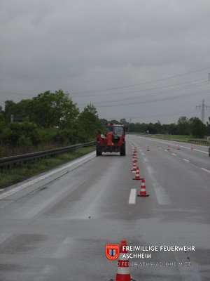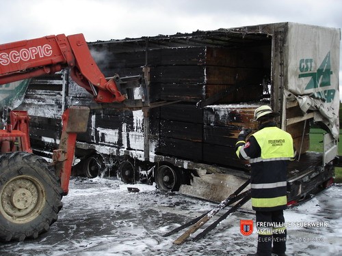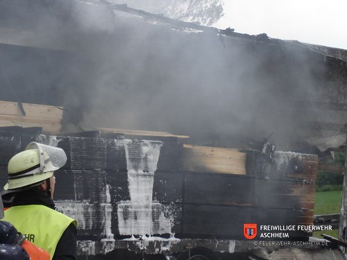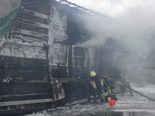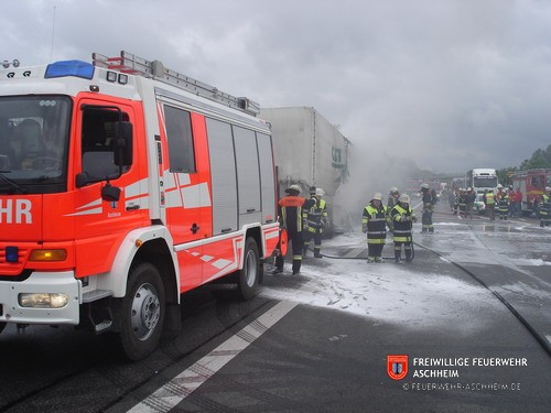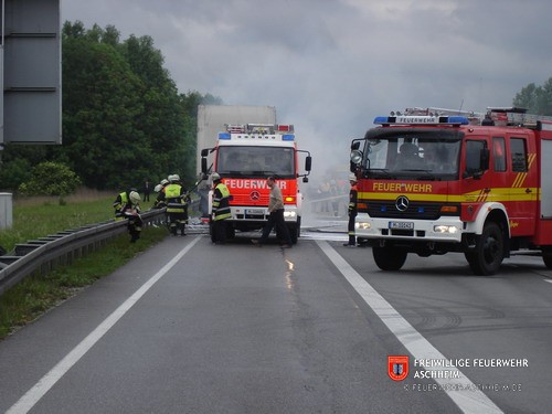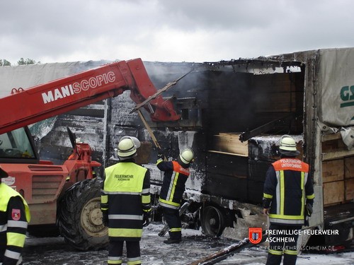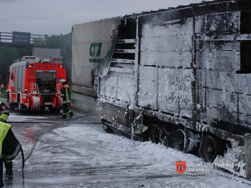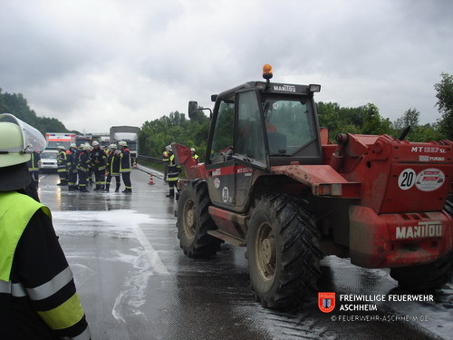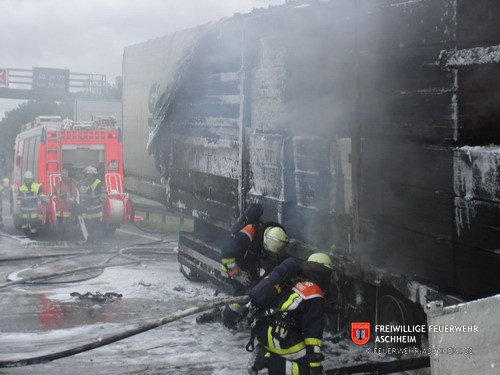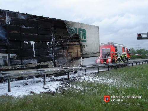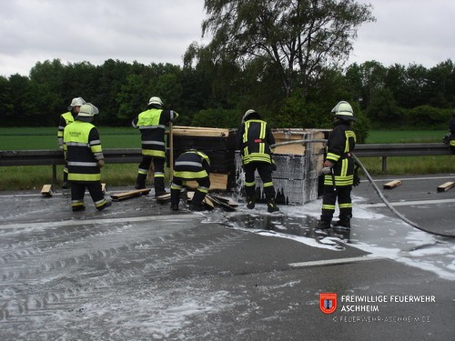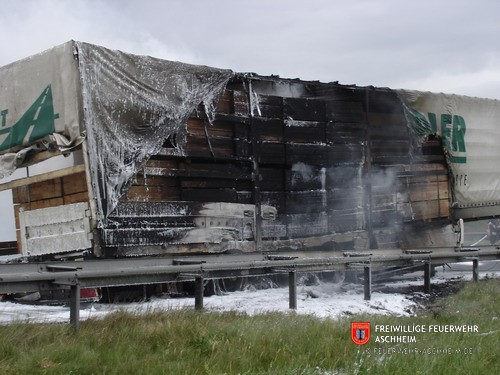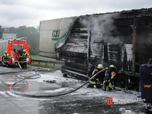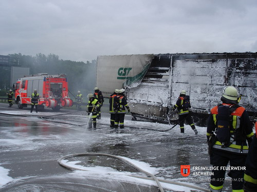 Die Feuerwehr Aschheim wurde zur Unterstützung der Feuerwehren Unterföhring und Ismaning auf die Bundesautobahn 99 in Fahrtrichtung Salzburg alarmiert. Ein mit 26 Tonnen Holz beladener LKW war in Brand geraten.