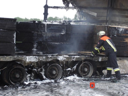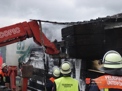 Da das geladene Holz war auf Paletten gestapelt und war dadurch auf dem LKW nur schwer zu löschen. Mit Hilfe eines Hubgerätes, das kurzerhand auf die Autobahn gebracht wurde, konnte das Holz dann abgeladen, getrennt und vernünftig abgelöscht werden.