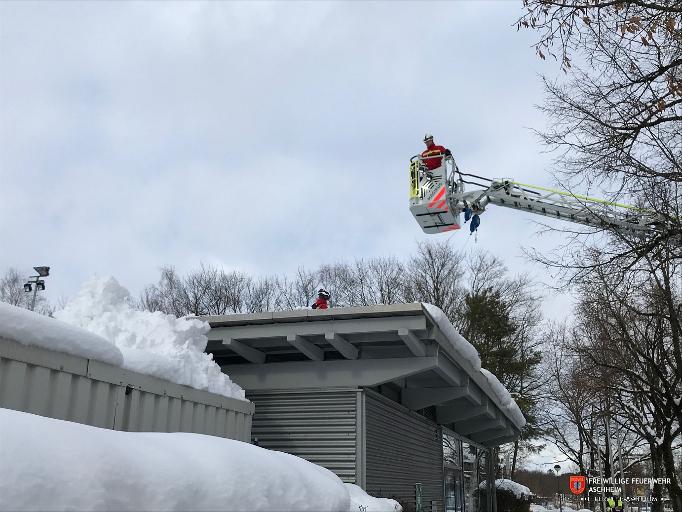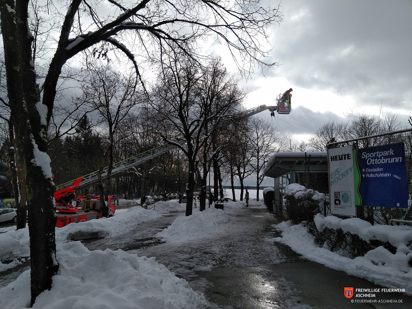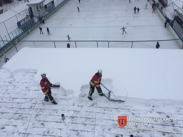 Die Feuerwehr Aschheim wurde zum Ottobrunner Eisstadion gerufen. Aufgrund hoher Schneelast musste das Flachdach des Eingangs geräumt werden.