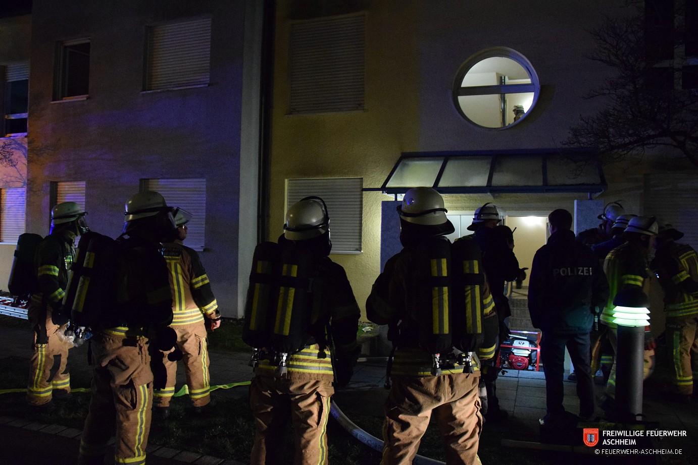 Dort kam es entgegen der Ersten Meldung zu einer Verrauchung in einer Wohnung, nicht im Treppenhaus. Ein Bewohner des Mehrfamilienhauses bemerkte kurz vor Mitternacht das Pfeifen mehrerer Rauchwarnmelder in der Wohnung unter ihm woraufhin er den Notruf wählte. Bei Eintreffen der Feuerwehr hatte der Anrufer bereits eine Person aus der betreffenden Wohnung gerettet, die Wohnungstüre geschlossen und den Strom abgestellt. Da sowohl bei der Bewohnerin, die zwischenzeitlich in die Wohnung des Mitteilers gebracht wurde, als auch beim Mitteiler selber eine Rauchgasintoxikation anzunehmen war, wurden weitere Rettungswägen, Notarzt und ein Cyano-Kit nachgefordert.