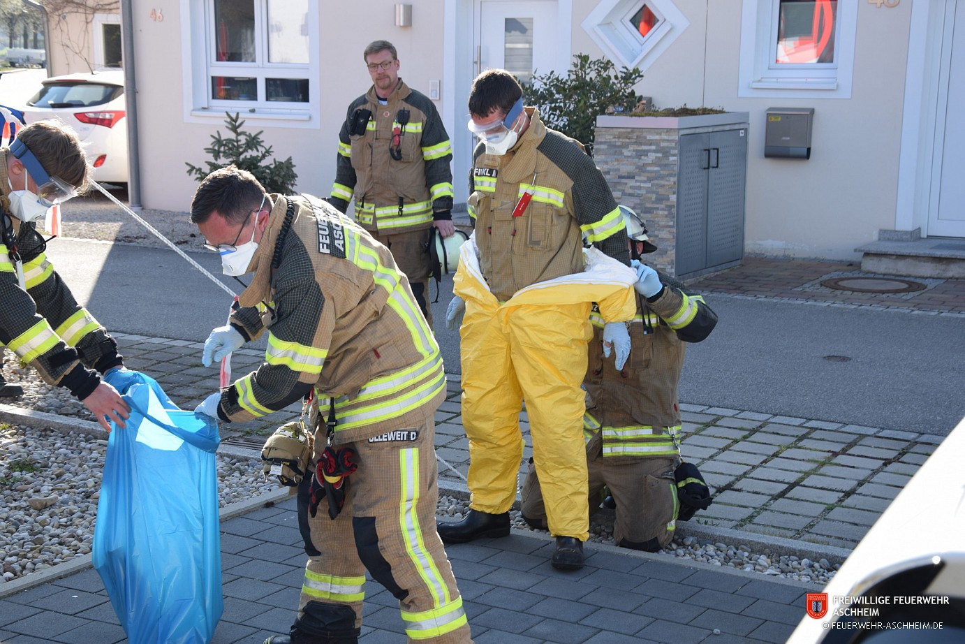 Während für die Hausbewohner damit der Einsatz beendet war, erfolgte im Freien unter sorgsamer Beachtung der einschlägigen Dekontaminationsregeln das Ablegen der Schutzkleidung. Einwegschutzkleidung wurde entsprechend gesammelt und für den Abtransport zur Entsorgung verpackt. Gleichzeitig wurden in einem weiteren verschlossenen Behälter die Kleidungsteile gesammelt, die nach einer Reinigung und Desinfektion wieder verwendet werden können. Im Anschluss wurden alle eingesetzten Geräte und Werkzeuge intensiv gesäubert und desinfiziert.