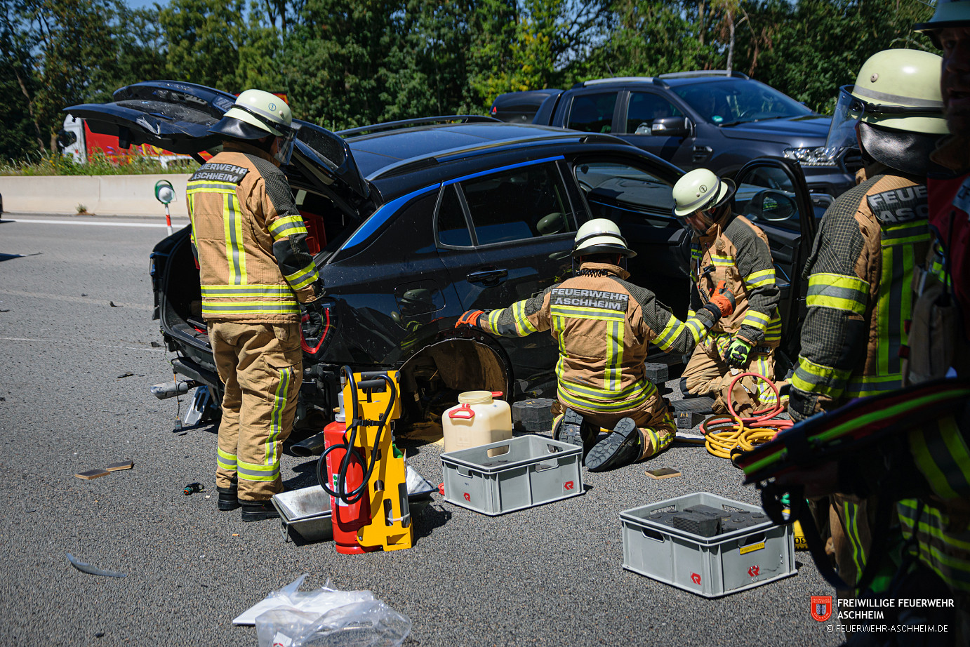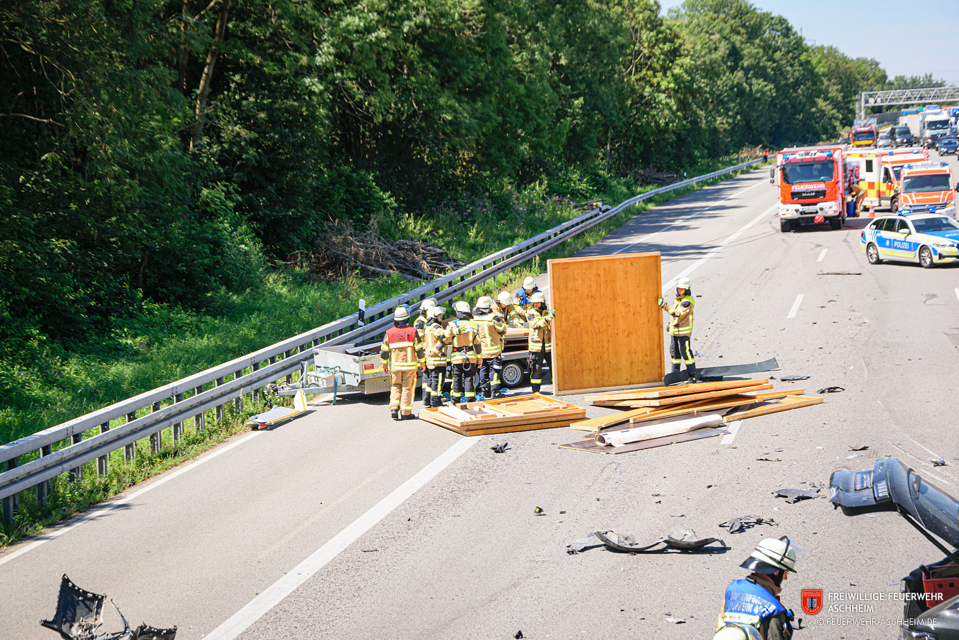 Beim Eintreffen war bereits die ebenfalls alarmierte Polizei anwesend, welche die Unfallstelle absicherte. Vor Ort war es zu einem Verkehrsunfall zwischen zweier Pkw und einem daran befindlichen Anhänger gekommen. Da sich die Unfallstelle über den Standstreifen und die drei rechten Fahrstreifen erstreckte, wurde die anwesende Polizei bei der Absicherung unterstützt. Zeitgleich wurde zum Brandschutz ein Kleinlöschgerät und C-Rohr zur schnellen Wasserabgabe am Unfallfahrzeug vorbei aufgestellt. Außerdem wurde auslaufender Kraftstoff aufgefangen und mit Bindemittel gebunden.