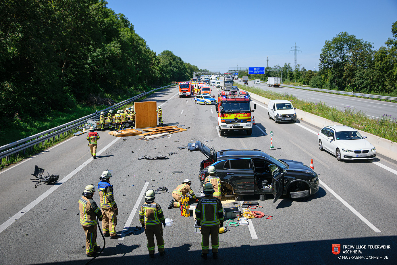 Die Kräfte der Feuerwehr Aschheim wurden zu einem Verkehrsunfall auf die BAB 99 in Fahrtrichtung Lindau alarmiert. Zunächst erfolgte die Einsatzmeldung in Fahrtrichtung Salzburg, doch während der Alarmfahrt wurden die Kräfte durch die Einsatzzentrale umdisponiert. Zusätzlich wurden die primär zuständigen Kräfte der Feuerwehr Unterföhring alarmiert.