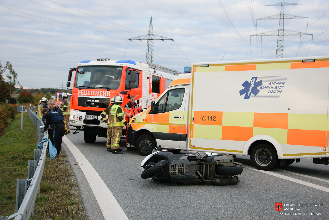 Die Kräfte der Feuerwehr Aschheim wurden aufgrund eines Verkehrsunfalls zwischen einem Krad und einem Pkw auf die BAB 99 in Fahrtrichtung Lindau alarmiert.