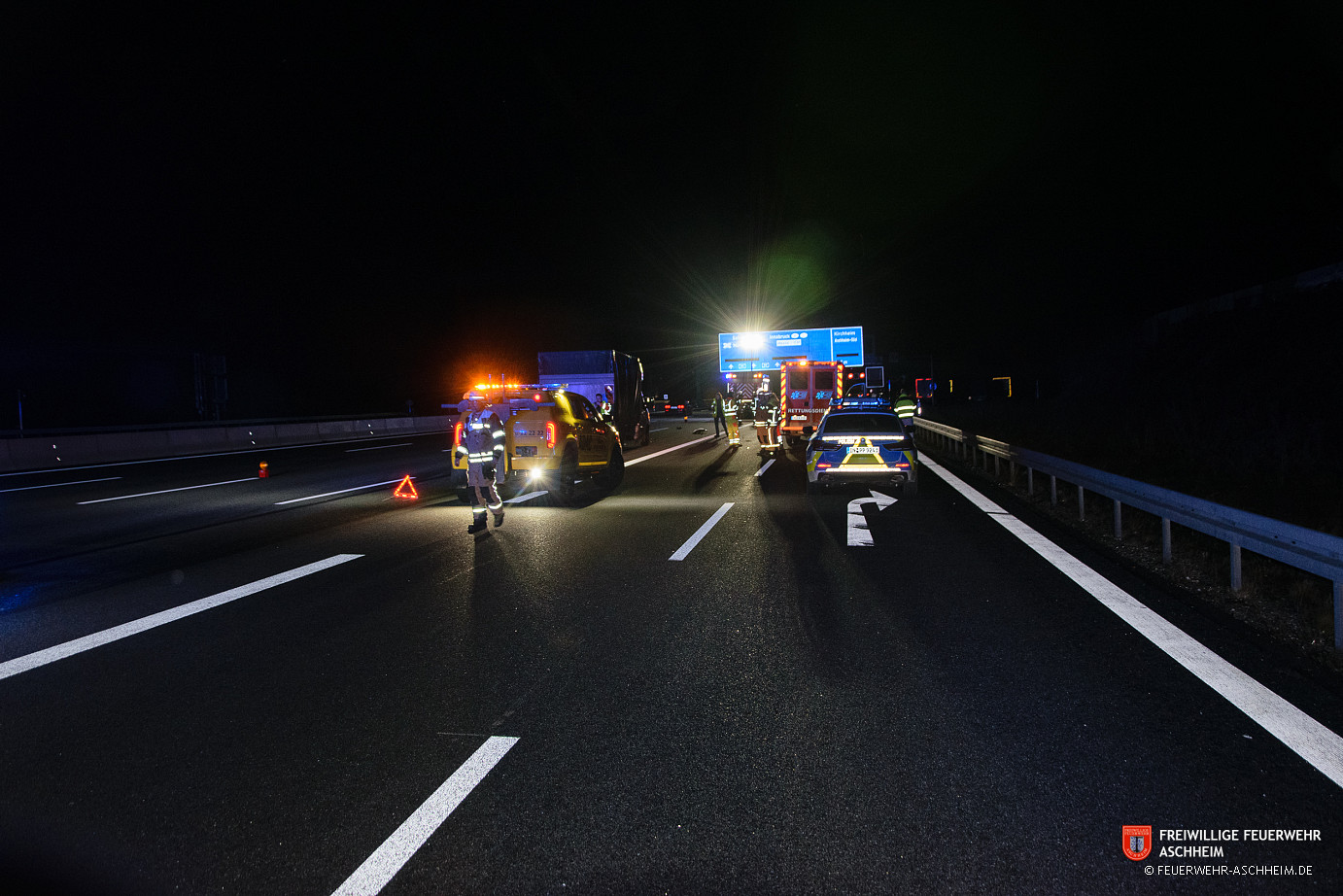 Lage: kurz vor dem Parkplatz Aschheim/Kirchheim auf der BAB 99 in Fahrtrichtung Süden waren zwei PKW kollidiert. Bei Ankunft der Feuerwehr befand sich ein Kleintransporter auf den zwei rechten Fahrbahnspuren. Das Fahrzeug des Unfallgegners war nicht vor Ort. Trümmerteile waren über alle vier Spuren verteilt. Ein RTW sowie ein Fahrzeug eines Abschleppdienstes hatten die Verkehrsabsicherung übernommen.
