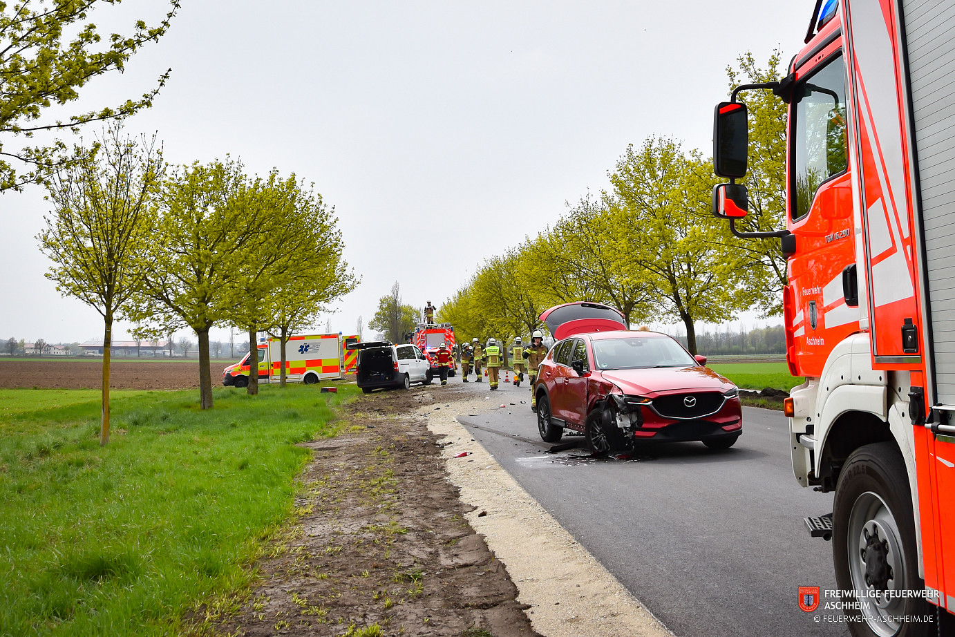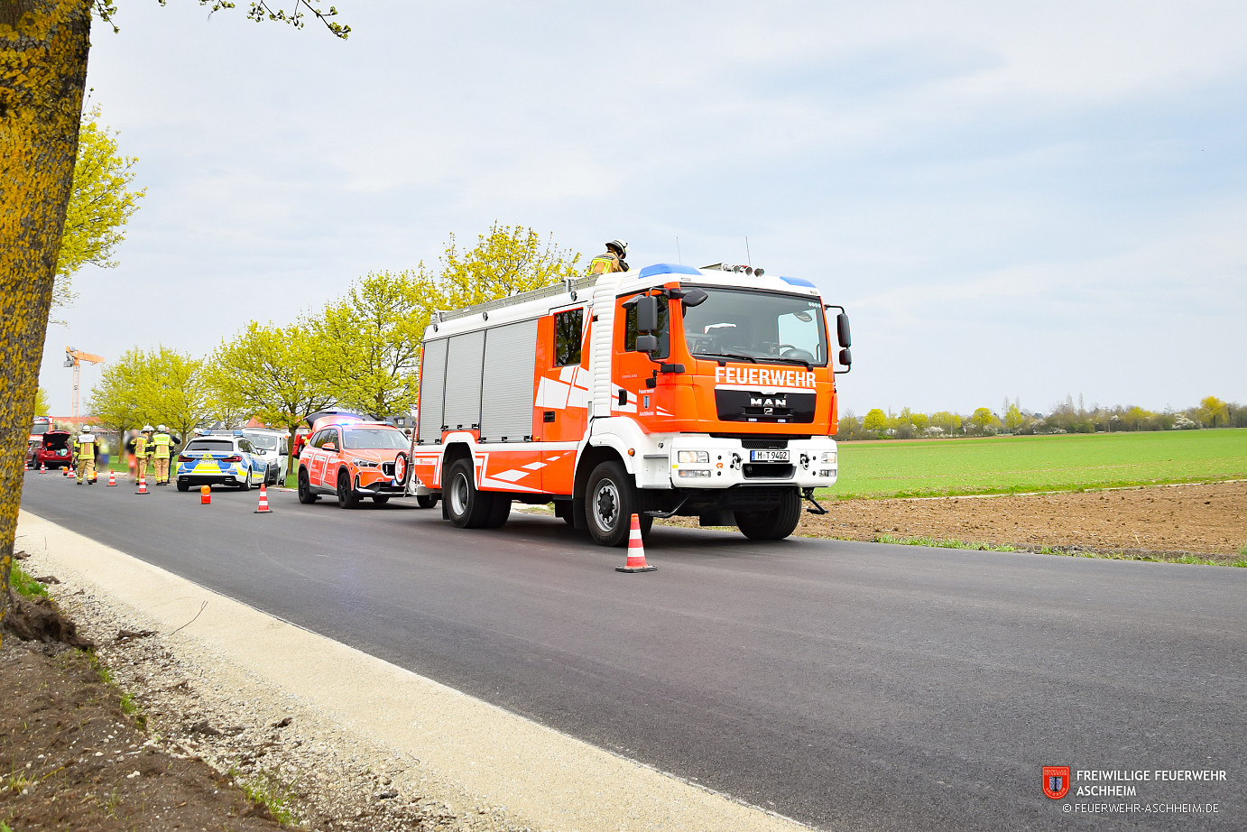 Lage: Auf der Münchner Straße zwischen Aschheim und Dornach kam es zu einem Verkehrsunfall mit zwei beteiligten Fahrzeugen. Die Insassen hatten die Fahrzeuge bereits selbständig verlassen und wurden von Ersthelfern betreut.