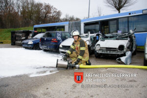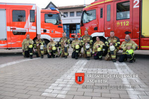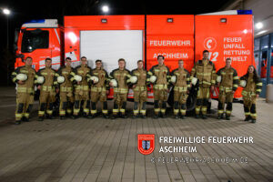 Im Zeitraum vom 13. September bis 13. November 2025 führte die Freiwillige Feuerwehr Aschheim den Lehrgang zur Ausbildung von Atemschutzgeräteträgern durch. Die Ausbildung umfasste theoretische Grundlagen sowie umfangreiche praktische Übungen, insbesondere Gewöhnungs- und Belastungsübungen mit Filter- und Pressluftatmern sowie taktische Module wie Schlauchmanagement, Türöffnung, Vorgehen unter Nullsicht und Menschenrettung. Ein Schwerpunkt lag auf der praktischen Umsetzung der Inhalte in realitätsnahen Trainingssituationen. Sechs Teilnehmer absolvierten zusätzlich eine Einsatzübung in der Brandsimulationsanlage, um das taktische Vorgehen unter einsatzähnlichen Rahmenbedingungen weiter zu vertiefen. Dazu kommen zwei weitere Teilnehmer, die bereits die Befähigung zum Chemikalienschutzanzugträger absolviert haben.