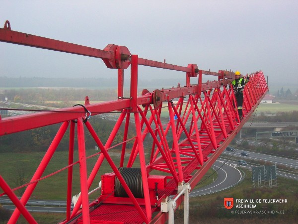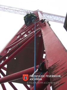 Im zweiten praktischen Teil der Fortbildung , welcher auf der Baustelle der Firma „Riedel Bau GmbH & Co. KG“ an der Eichendorff Straße stattfand, galt es dann, einen vertikalen Vorstieg an einem Baukran bis auf eine Höhe von etwa 20 Metern durchzuführen. Nachdem alle Teilnehmer diese Aufgabe hervorragend gemeistert hatten, ging es bis ganz hinauf auf den Baukran. Dort hatten die Kameraden dann die Möglichkeit, im horizontalen Vorstieg – das heißt gesichert durch ein Kernmanteldynamikseil, welches in die von ihnen gesetzten Zwischensicherungen eingehängt und gesichert durch zwei Kameraden wurde – auf den Ausleger des Baukrans in knapp 40 Meter Höhe hinauszugehen. Dies stellte insbesondere eine mentale Herausforderung dar, da man sich ja nur noch auf einem äußerst schmalen Stahlträger vorwärts bewegte. Auch diese Herausforderung wurde von allen Teilnehmern mit Bravour gemeistert.